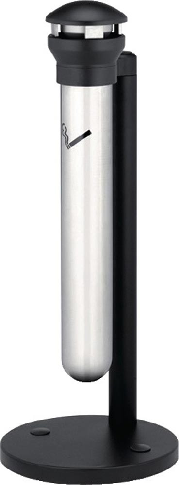 aus Edelstahl · Ständer aus Stahlblech und schwarz beschichtet · wetterfest - geschwungener Verschluss verhindert Eindringen von Regenwasser · Bodenplatte lässt sich am Boden festschrauben · großes Fassungsvermögen, leicht zu entleeren