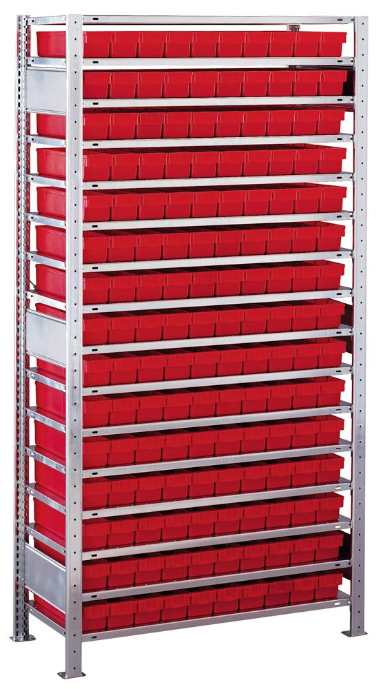 Steckegal, verzinkt, mit Kästen, Grundfeld, BxTxH 1000x300x2000 mm, 16 Böden, 150 rote Kästen, BxTxH 93x300x83 mm EP536767