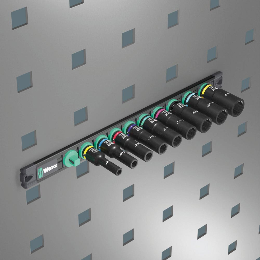 auf Magnetleiste zur temporären Befestigung z. B. an Wand, Regal, Werkstattwagen · leichtgängiger Drehmechanismus für sichere Aufbewahrung und einfache Entnahme des Werkzeuges · 3/8″-Antrieb · lange Ausführung für tiefliegende Verschraubungen und überstehende Gewindestangen · mit Sechskantprofil und Nut mit Bohrung · für den Einsatz mit elektrisch oder mit Druckluft angetriebenen Schlagschraubern mit 3/8″ Antrieb · Take it easy Werkzeugfinder: Farbkennzeichnung nach Größen - zum einfachen und schnellen Finden des benötigten Werkzeuges