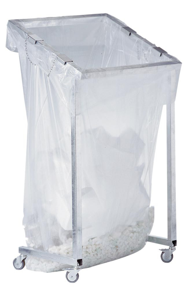 ∙ Steckbares Quadratrohrgestell aus Stahlblech ∙ Stabil und standfest ∙ Zerlegte Anlieferung ∙ Einwurföffnung: 660 x 660 mm ∙ Geeignet für Industrie und Gewerbe, wo viel großvolumiger Abfall wie Styropor® oder Kartonagen anfällt · Für 1000 Liter Styropor-Sammelsäcke