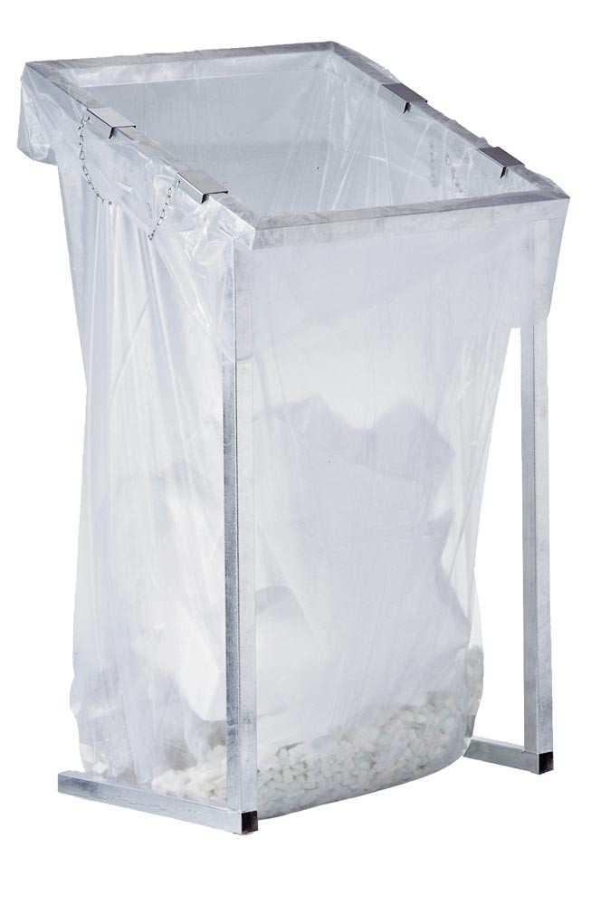 ∙ Steckbares Quadratrohrgestell aus Stahlblech ∙ Stabil und standfest ∙ Zerlegte Anlieferung ∙ Einwurföffnung: 660 x 660 mm ∙ Geeignet für Industrie und Gewerbe, wo viel großvolumiger Abfall wie Styropor® oder Kartonagen anfällt · Für 1000 Liter Styropor-Sammelsäcke