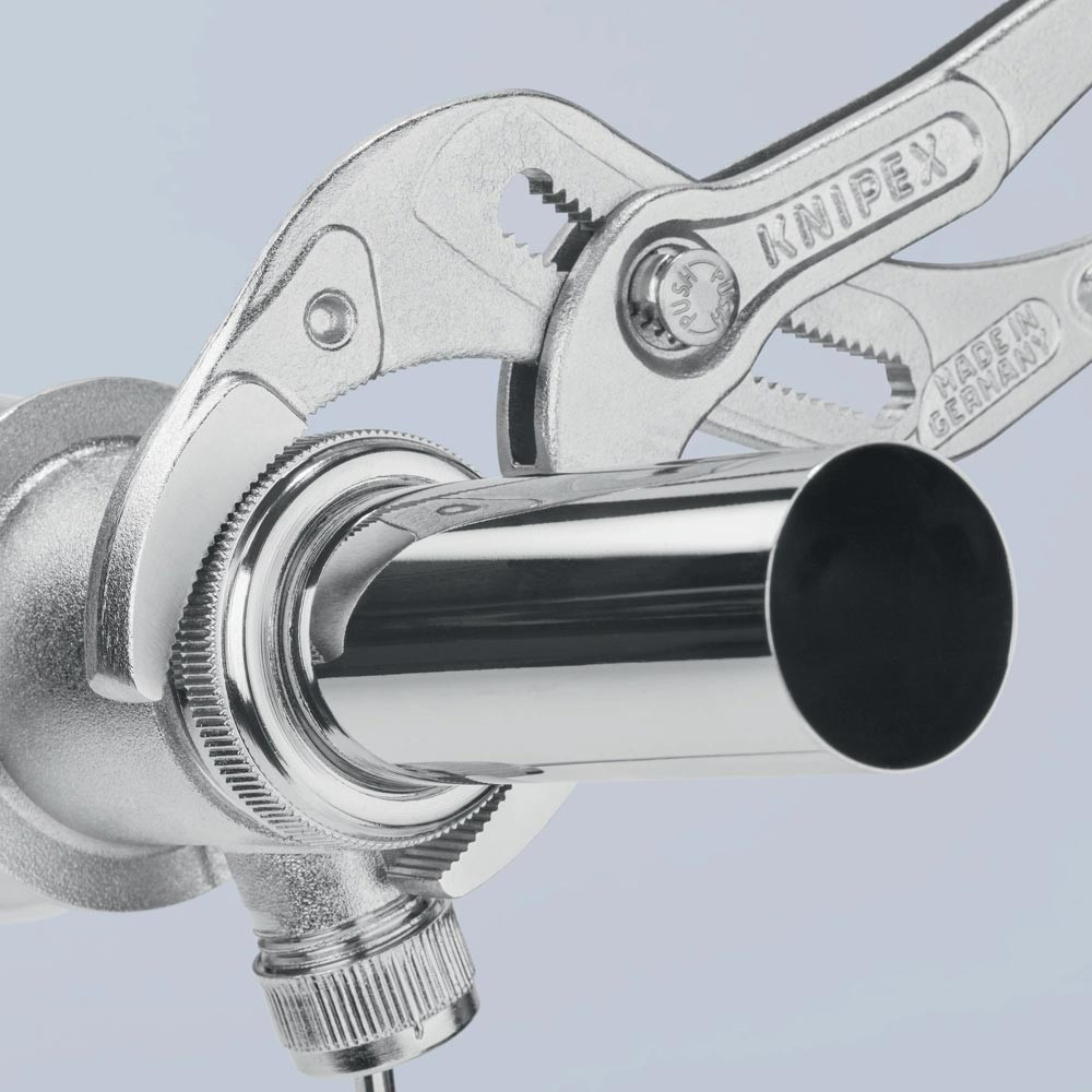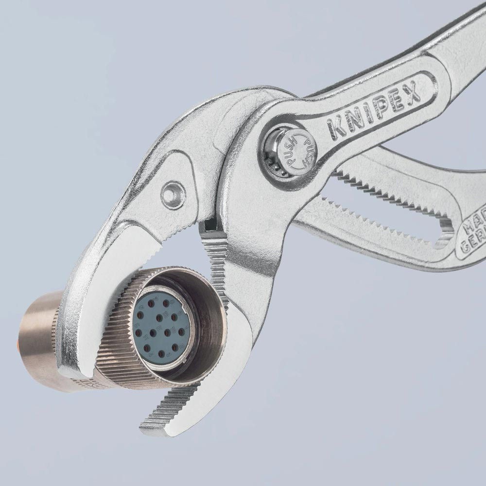 25-fach verstellbares, durchgestecktes Gelenk · Druckknopfverstellung · ergonomische Schenkelgeometrie · zum Anziehen und Lösen von Siphon-Verschraubungen, Kunststoff-Rohrverbindungen und runden Überwurfmuttern · Chrom-Vanadin-Elektrostahl, geschmiedet, ölgehärtet
