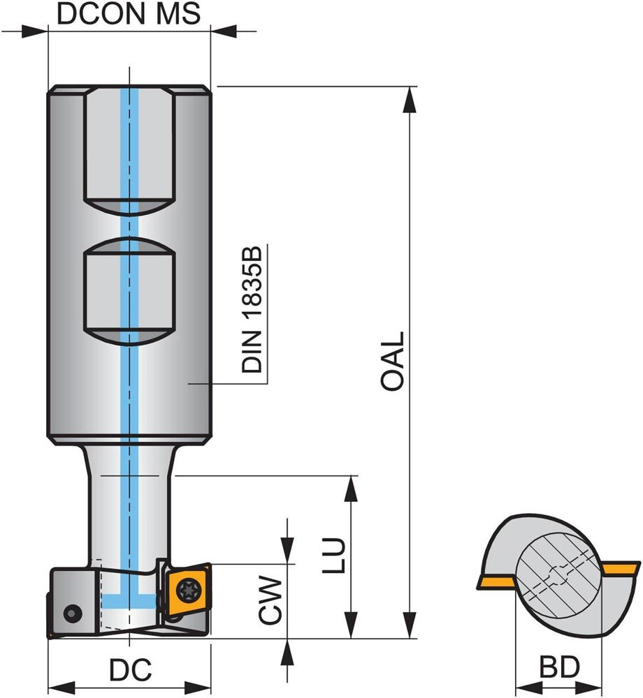T-Nutenfräser zum spannen von 2 Stück CCMX 08T308 einseitigen Wendeschneidplatten · Schnittdurchmesser 32mm mit 90° Anstellwinkel und 32mm Weldon Schaft gemäß DIN 1835B · 98mm Gesamtlänge · Kühlkanalbohrung zum T-Nutenfräsen und rückseitiges Fräsen mit einer maximalen Schnitttiefe von 14mm