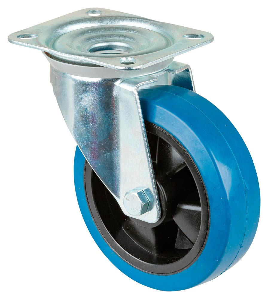 Transportgeräte-Lenkrolle, Elastik-Vollgummi blau, Durchm. 100 mm, Traglast 150 kg, Kugellager, Anschraubplatte, Fadenschutz EP560860