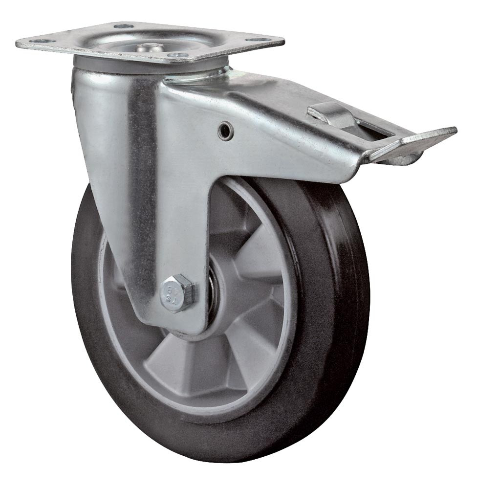 Transportgeräte-Lenkrolle m. Festst., Elastik-Vollgummi schwarz, Durchm. 160 mm, Traglast 300 kg, Kugellager, Anschraubplatte
