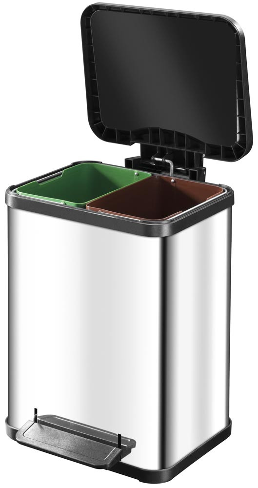 ∙ Rechteck-Gehäuse mit einzelnen Inneneimern zur Mülltrennung ∙ Stabil und standfest ∙ Deckel aus hochwertigem Kunststoff in schwarz mit Vertiefung zur Kennzeichnung der Abfallsortierung, inkl. Farbsticker zur Müllsorten-Kennzeichnung · Gedämpfter Deckel-Schließ-Mechanismus - Deckel schließt leise · Großer Öffnungswinkel zum leichten Befüllen · Ergonomischer Tragegriff im Deckelscharnier integriert · Ergonomisch breites Fußpedal · Innenliegende, hygienische Tretmechanik · Standfest durch breiten Bodenring