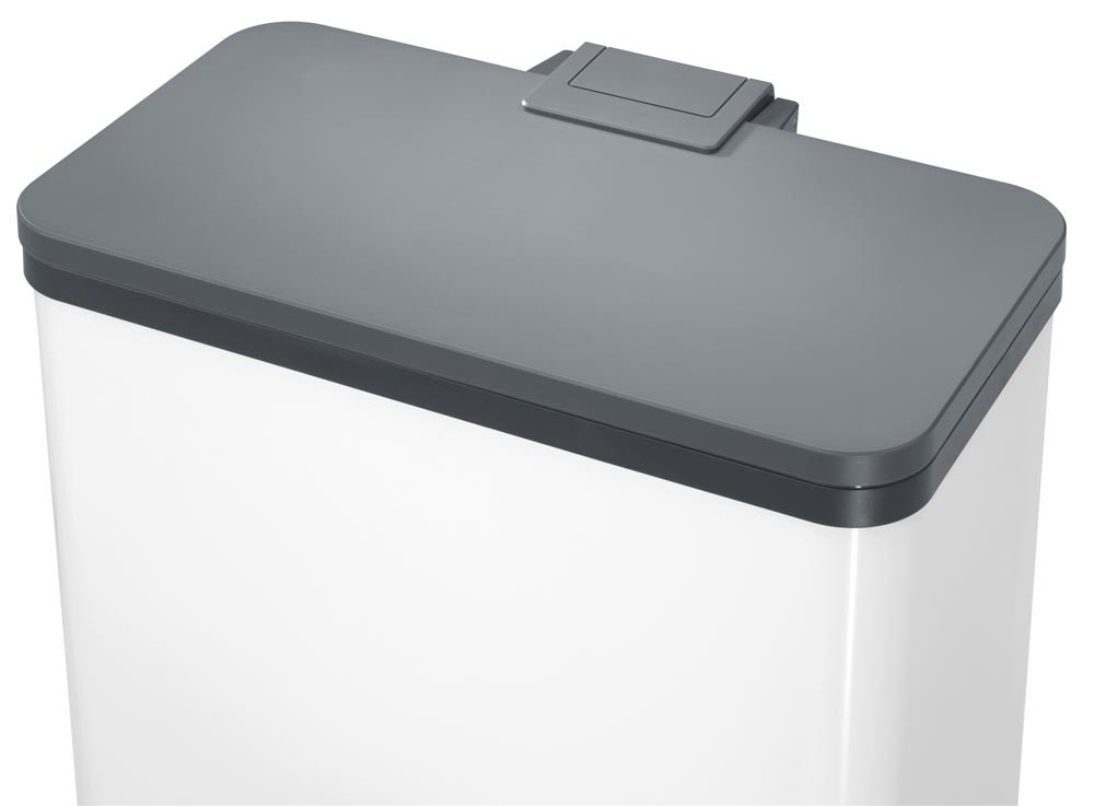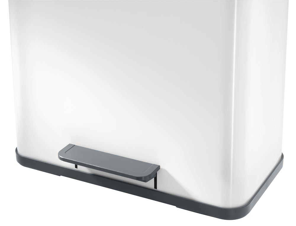 ∙ Rechteck-Gehäuse mit einzelnen Inneneimern zur Mülltrennung ∙ Stabil und standfest ∙ Deckel aus hochwertigem Kunststoff in schwarz mit Vertiefung zur Kennzeichnung der Abfallsortierung, inkl. Farbsticker zur Müllsorten-Kennzeichnung · Gedämpfter Deckel-Schließ-Mechanismus - Deckel schließt leise · Großer Öffnungswinkel zum leichten Befüllen · Ergonomischer Tragegriff im Deckelscharnier integriert · Ergonomisch breites Fußpedal · Innenliegende, hygienische Tretmechanik · Standfest durch breiten Bodenring