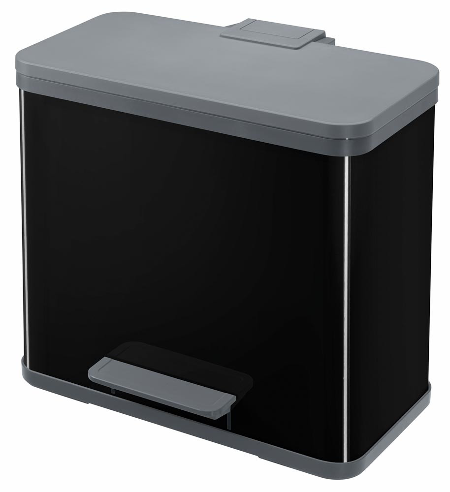 ∙ Rechteck-Gehäuse mit einzelnen Inneneimern zur Mülltrennung ∙ Stabil und standfest ∙ Deckel aus hochwertigem Kunststoff in schwarz mit Vertiefung zur Kennzeichnung der Abfallsortierung, inkl. Farbsticker zur Müllsorten-Kennzeichnung · Gedämpfter Deckel-Schließ-Mechanismus - Deckel schließt leise · Großer Öffnungswinkel zum leichten Befüllen · Ergonomischer Tragegriff im Deckelscharnier integriert · Ergonomisch breites Fußpedal · Innenliegende, hygienische Tretmechanik · Standfest durch breiten Bodenring