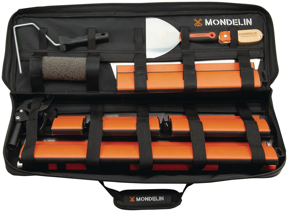 zum Spachteln, Glätten, Schneiden und Arbeiten an Fugen · textile Tasche mit integrierten Klingenschützern, Klettfixierung, Tragegriffen und Schultergurt · leicht, waschbar und ideal für den mobilen Einsatz