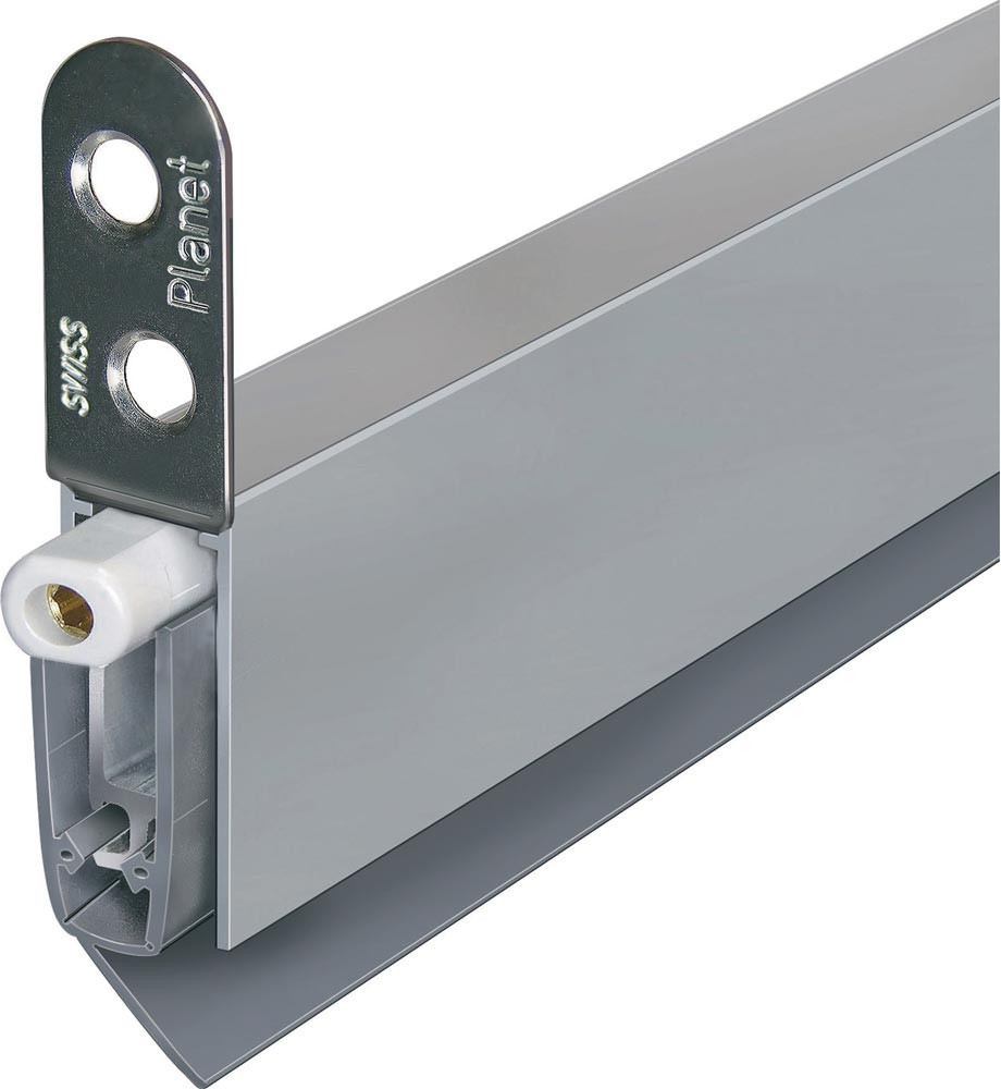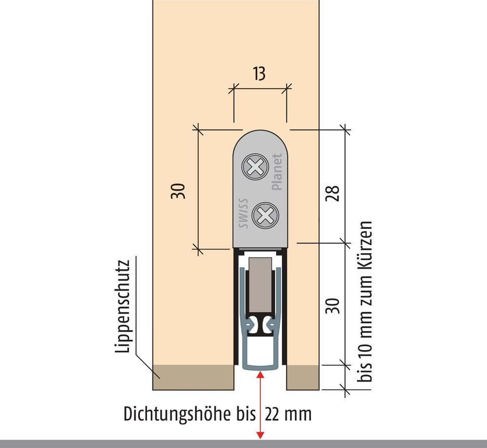 automatische Türabsenkdichtung FH+RD 48 dB · für schall-, rauch- und feuerhemmende Türen · bandseitige einseitige Auslösung mit automatischem Ausgleich bei schiefem Boden · Parallelabsenkung · Dichtungshöhe bis 22 mm · zum Einnuten bündig oder tiefer mit Lippenschutz · kürzbar um 125 mm · seitliche Befestigung · Lippe aus selbstverlöschendem Silikon · Aluminium