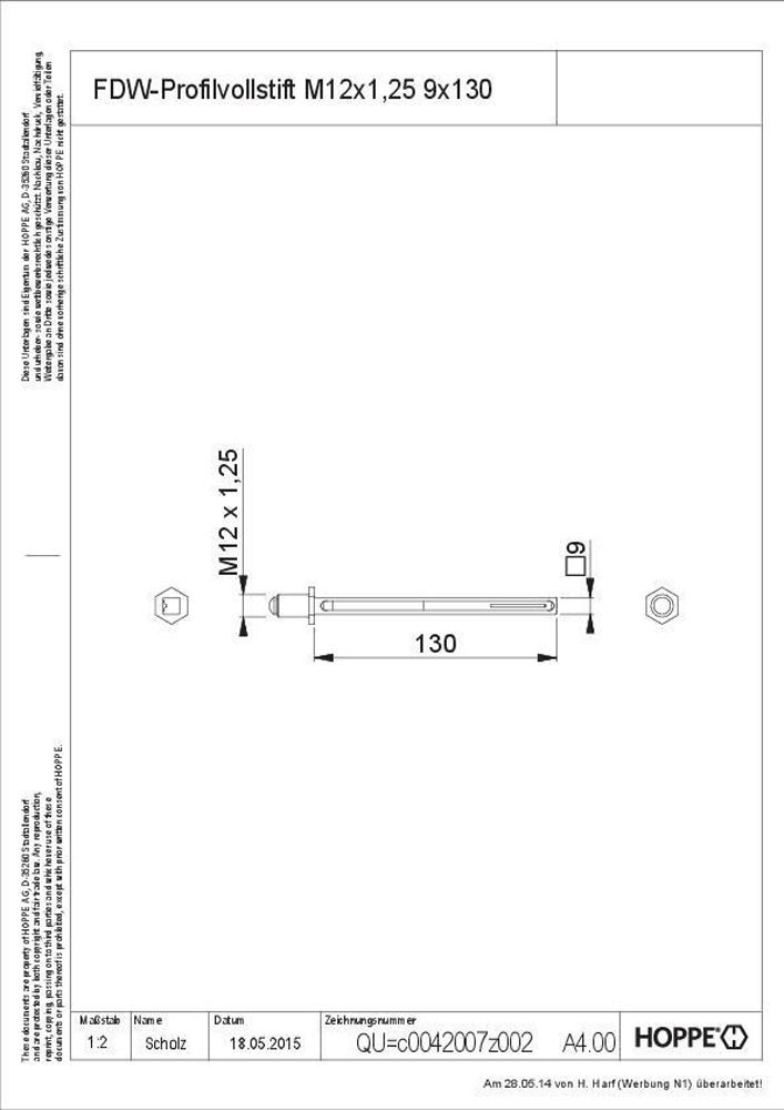 Eisen-FDW-Profilvollstift: mit gehärteter Flachfeder zum Toleranzausgleich in der Schlossnuss ausschließlich für HOPPE-Knopfschilder und -Wechsel-Garnituren mit Knopf