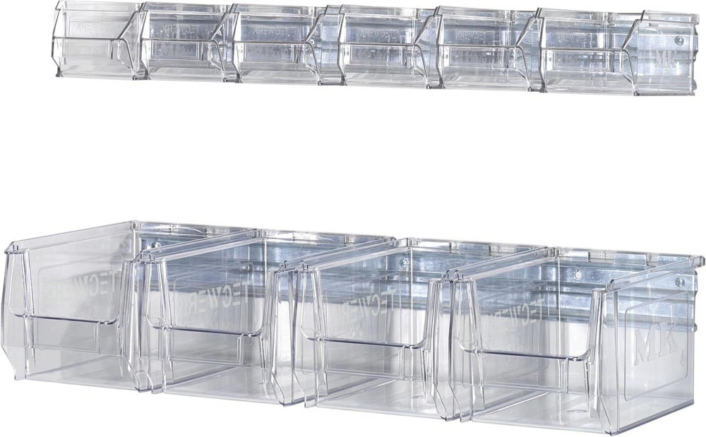 Wandschiene H130xB602xT200mm Stahl verzinkt mit Sichtlagerkästen 4 x MK4 transparent
