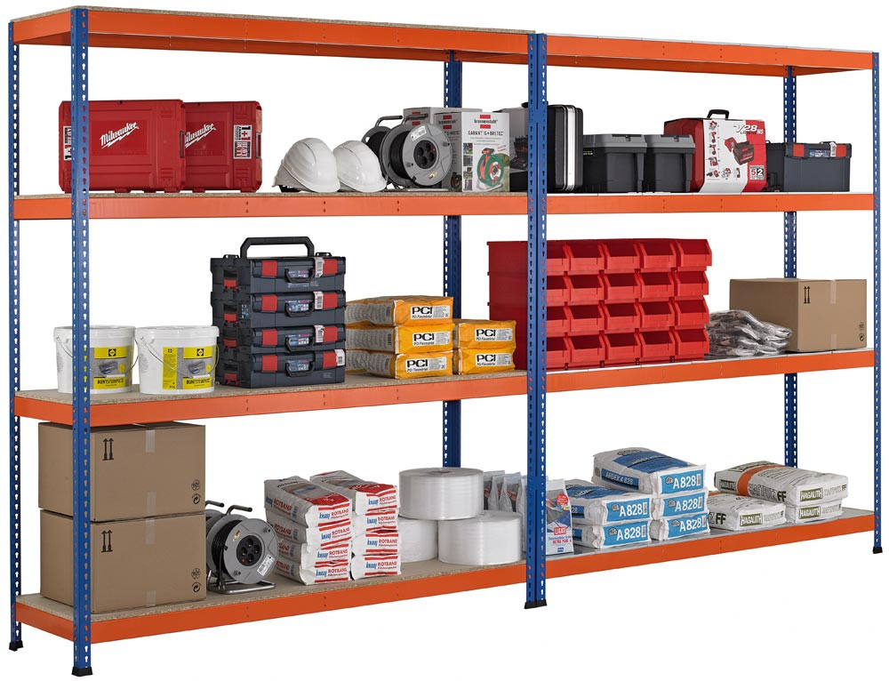 Weitspannregal, 4 Lagerebenen mit Spanplattenboden, BxTxH 1841x469x1981 mm, Fachlast 610 kg, Ständer blau, Traversen orange EP513479