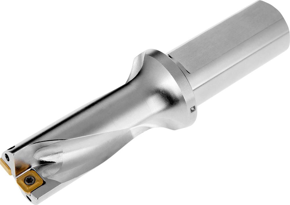 Wendeschneidplattenbohrer zum einsetzen von einer XPET 0703.. Wendeschneidplatten als Zentrumschneide und einer SCET 0703.. Wendeschneidplatte als Außenschneide · Bohrdurchmesser 23mm in Kombination mit EP253253 · geeignet für eine radiale Verstellung von -0.35 bis +0.50mm · mit einem 25mm abgeflachten Zylinderschaft nach ISO 9766 und Innenkühlung für maximale Bohrtiefen bis 2 x D