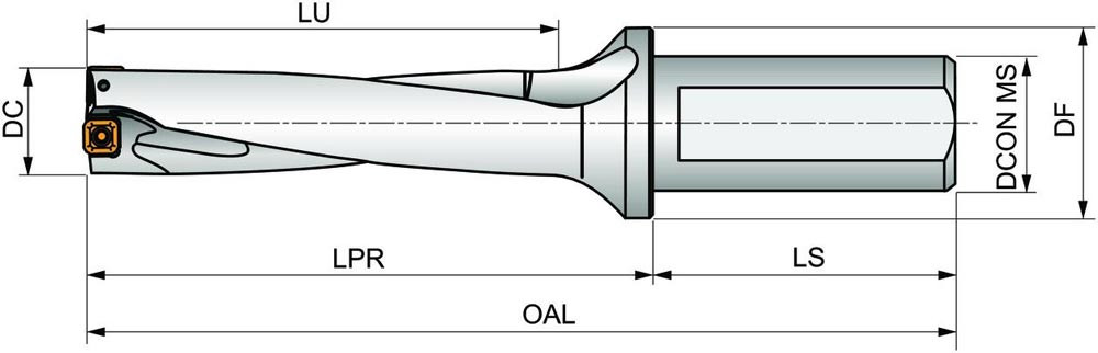 Wendeschneidplattenbohrer zum einsetzen von einer XPET 1904.. Wendeschneidplatten als Zentrumschneide und einer SCET 1505.. Wendeschneidplatte als Außenschneide · Bohrdurchmesser 56mm · mit einem 40mm abgeflachten Zylinderschaft nach ISO 9766 und Innenkühlung für maximale Bohrtiefen bis 4 x D