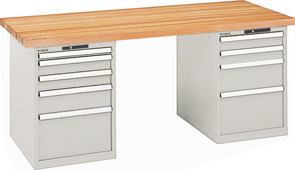 Werkbank, 2 Schubladenblöcke, links 5 Schubladen, rechts 4 Schubladen, Zylinderschloss, Multiplexpl. 40 mm, BxTxH 2000x750x840 mm, RAL 7035 EP526051
