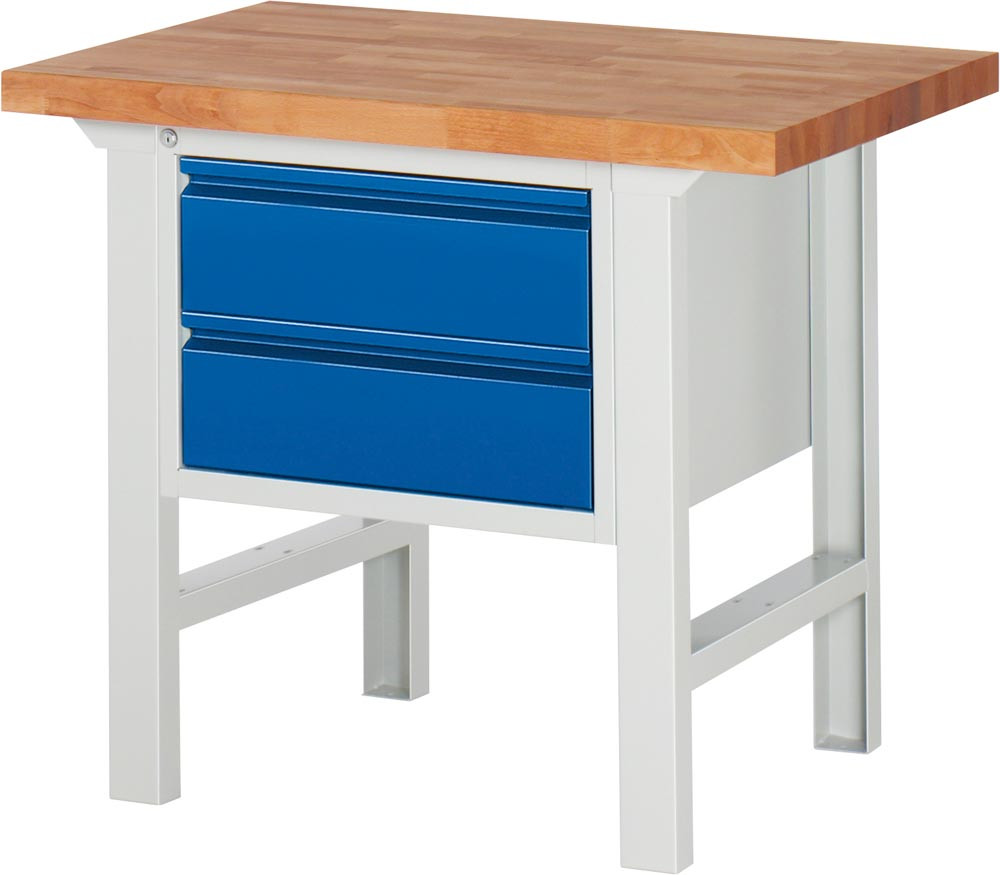 Werkbank, BxTxH 1000x700x840 mm, Platte Buche 40 mm, 2 Schubladen 180 mm, RAL 7035/5010 EP531057