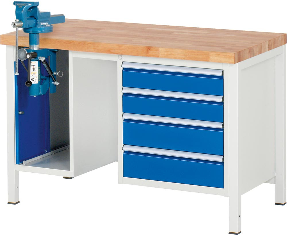 Werkbank, BxTxH 1250x700x840-1040 mm, Platte Buche, 4 Schubl.: 2 x 120/2 x 150 mm, 1 Schraubstockschrank, Schraubstock m. Klapplift, RAL7035/5010 EP562686