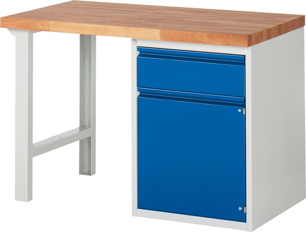 Werkbank, BxTxH 1250x700x840 mm, Platte Buche 40 mm, 1 Schublade 180 mm, 1 Tür 540 mm, 1 Fachboden, RAL 7035/5010 EP531062