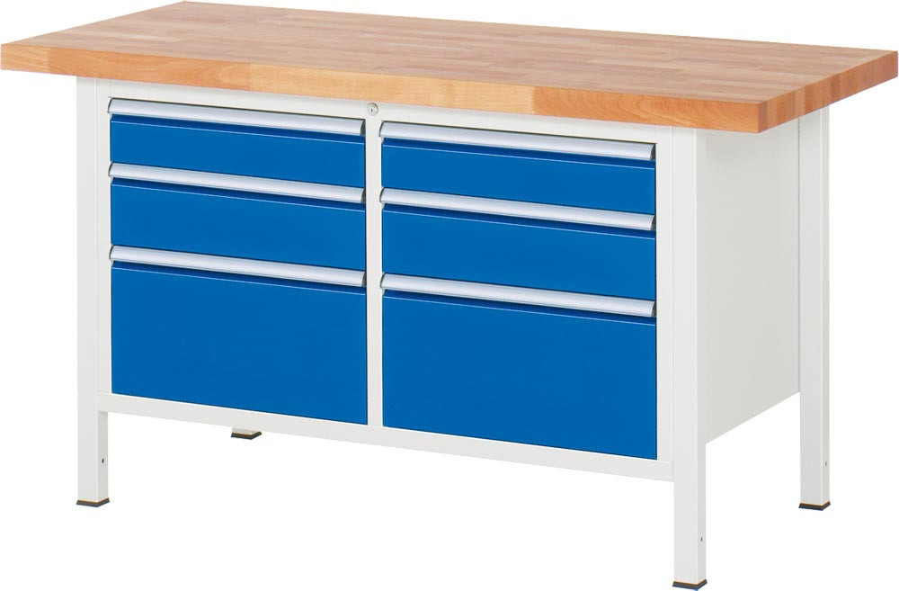 Werkbank, BxTxH 1500x700x840-1040 mm, 6 Schubladen: 2x120/2x150/2x270 mm, Platte Buche 40 mm RAL 7035/5010