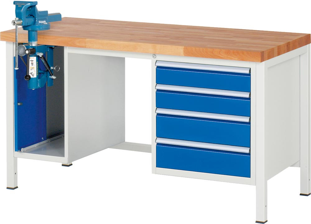 Werkbank, BxTxH 1500x700x840-1040 mm, Platte Buche, 4 Schubl.: 2 x 120/2 x 150 mm, 1 Schraubstockschrank, Schraubstock m. Klapplift, RAL7035/5010