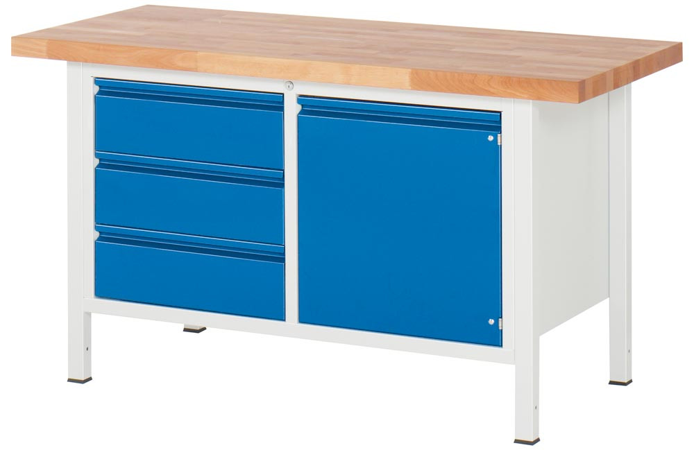 Werkbank, BxTxH 1250x700x840 mm, Platte Buche 40 mm, 3 Schubladen 180 mm, 1 Türen 540 mm, 1 Fachboden, RAL 7035/5010 EP531056