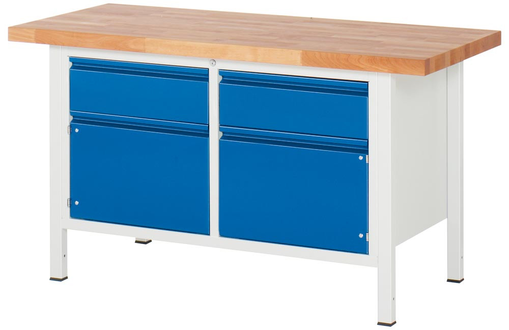 Werkbank, BxTxH 1500x700x840 mm, Platte Buche 40 mm mit Deckfunier, 2 Schubladen 180 mm, 2 Türen 360 mm, RAL 7035/5010 EP517336