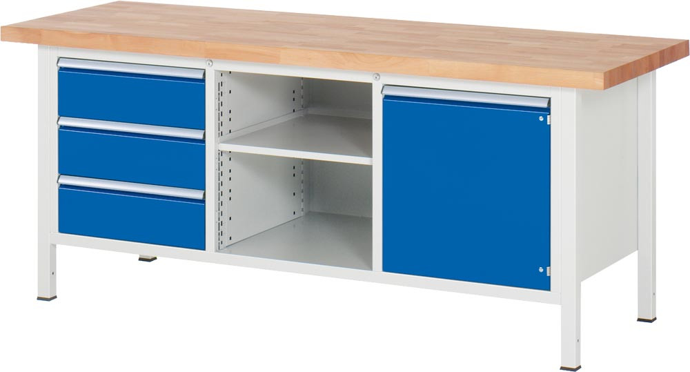 Werkbank, BxTxH 2000x900x840-1040 mm, 2 Schubladen 180 mm, 2 Türen 360 mm, 2 Böden, Platte Buche 40 mm, RAL 7035/5010 EP562762