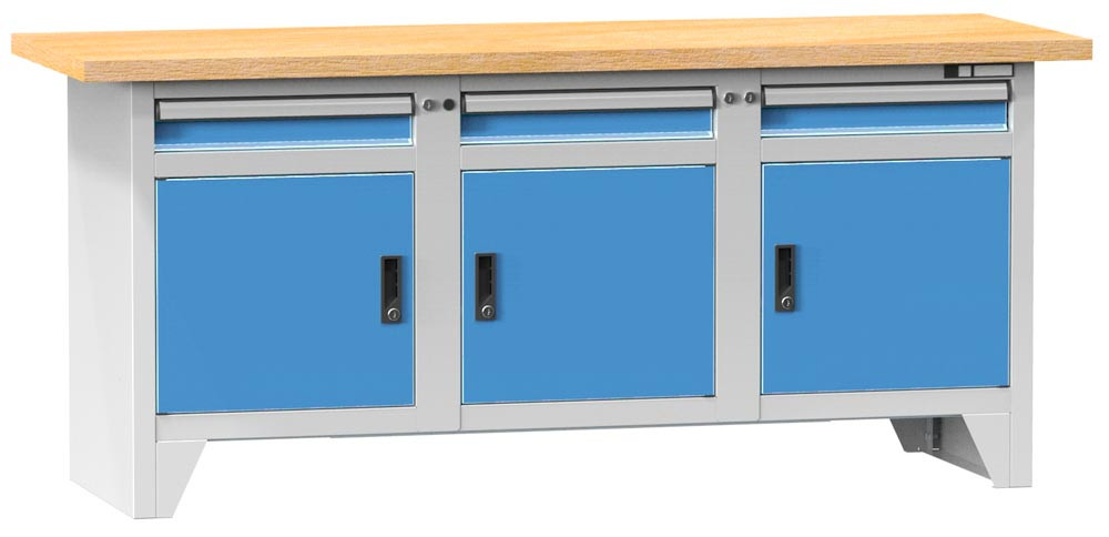 Werkbank, BxTxH 2000x700x880mm, 3 Module, 3 Schubladen 3x100 mm , 3 Türen, 3 Böden, Traglast 800 kg, RAL 7035/5012 EP557708