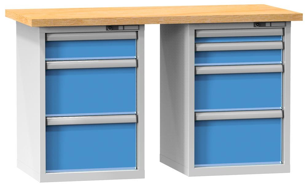 Werkbank, BxTxH 2000x800x880mm, 2 Blöcke, 7 Schubladen 75, 125, 150, 250, 3x300 mm, Traglast 700 kg, RAL 7035/5012 EP557695