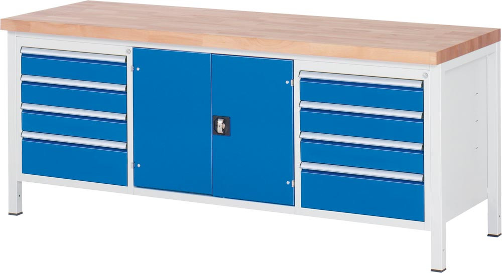 Werkbank, BxTxH 2000x900x840-1040 mm, 8 Schubladen: 6x120/2x180 mm, 1 Türfach mit 1 Boden, Platte Buche 40 mm, RAL 7035/5010 EP562774