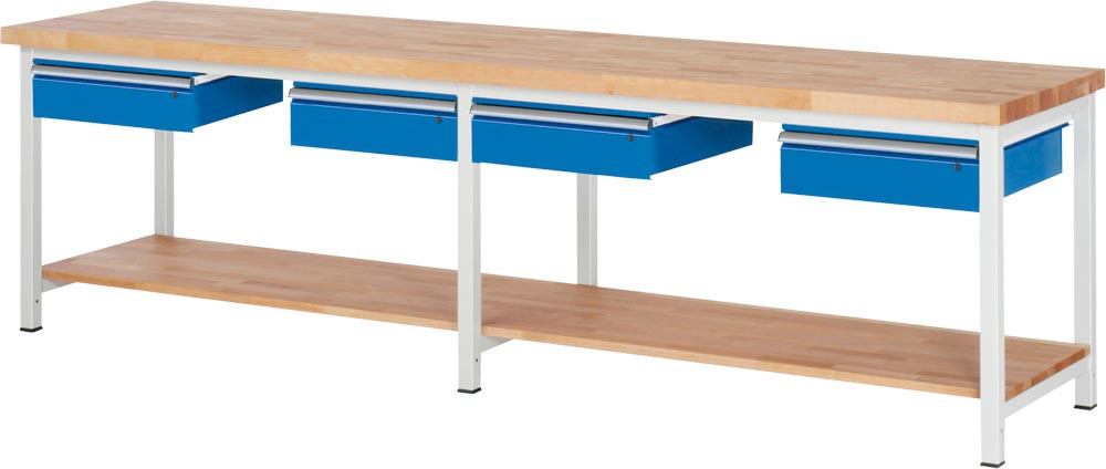 Werkbank, BxTxH 2500x900x840-1040 mm, 4 Hängeschubladen 150 mm, Platte Buche 40 mm, RAL 7035/5010, Ablageboden EP562781