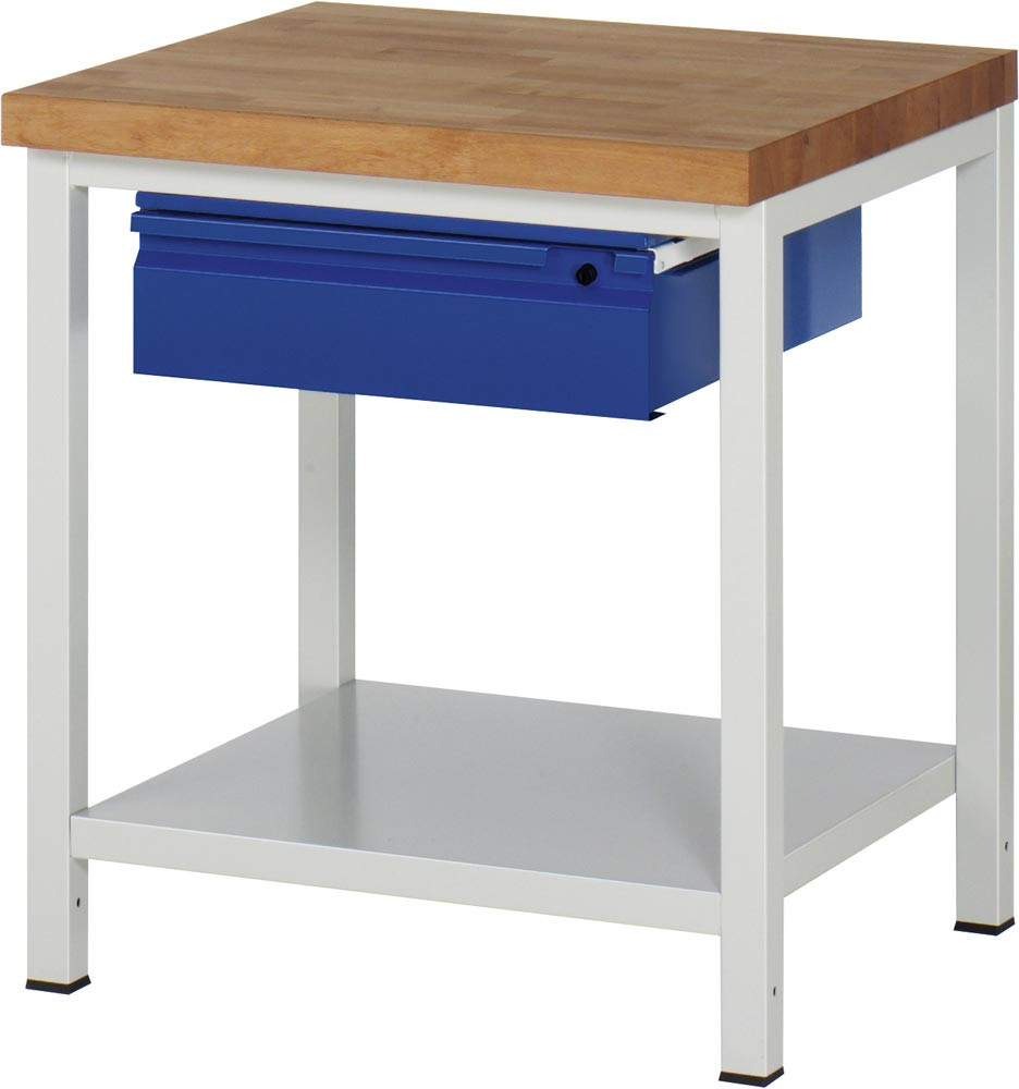 Werkbank, BxTxH 750x700x840 mm, Platte Buche 40 mm, inkl. Stahlblech-Ablageboden, 1x 150 mm Hängeschublade, RAL 7035/5010 EP531045