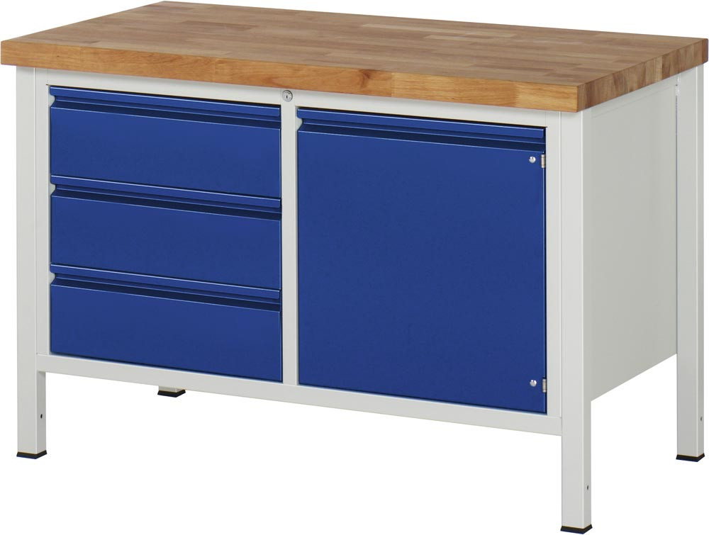 Werkbank, BxTxH 1250x700x840 mm, Platte Buche 40 mm, 3 Schubladen 180 mm, 1 Türen 540 mm, 1 Fachboden, RAL 7035/5010 EP531056