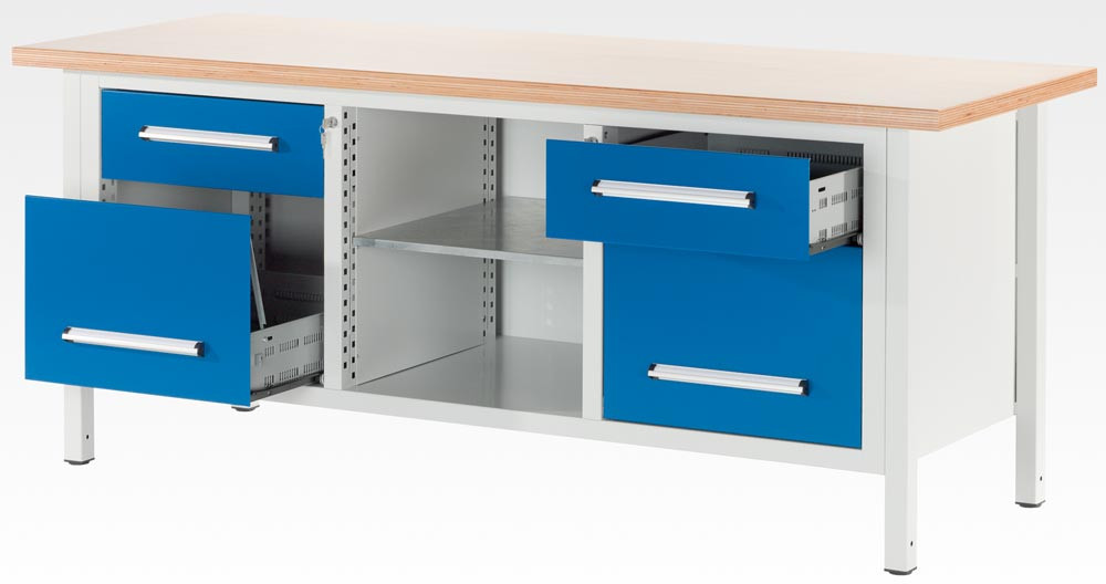 Ausführung: Robuste, verschweißte Stahlblech-Konstruktion, pulverbeschichtet ∙ Untergestell aus Vierkantrohr ∙ Höhenverstellbar ∙ Farblos lackierte 40 mm starke Buche-Multiplex-Platte mit gefasten Kanten, wasser- und ölbeständig ∙ Mit 4 Schubladen - 70 kg Traglast bei gleichmäßig verteilter Last mit Schlitzreihen zur Aufnahme von Einteilungsmaterial ∙ Schubladen 85% ausziehbar ∙ Zentrales Schließsystem ∙ Mit Griffleisten aus Aluminium mit Beschriftungsstreifen und Klarsichtabdeckung ∙ E 490 399 Fachböden, verzinkt, fest höhenverstellbar ∙ Farbe RAL 7035 lichtgrau/RAL 5010 enzianblau