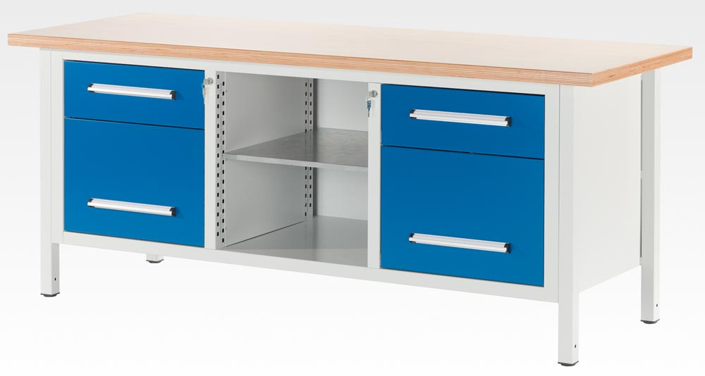 Werkbank 2000 mm RAL 7035/5010, 4 Schubladen 840-1040x2000x750 mm (HxBxT) RAL 7035/5010