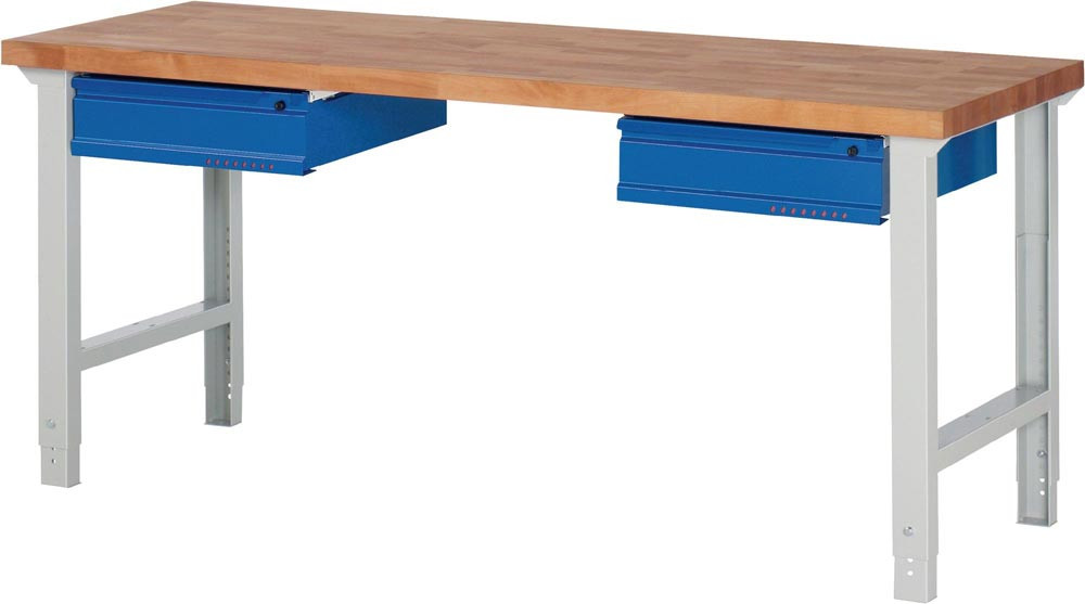Werkbank Serie BK 650 B2000xT700xH790-1140mm Buche massiv lichtgrau / enzianblau 2 Schubladen