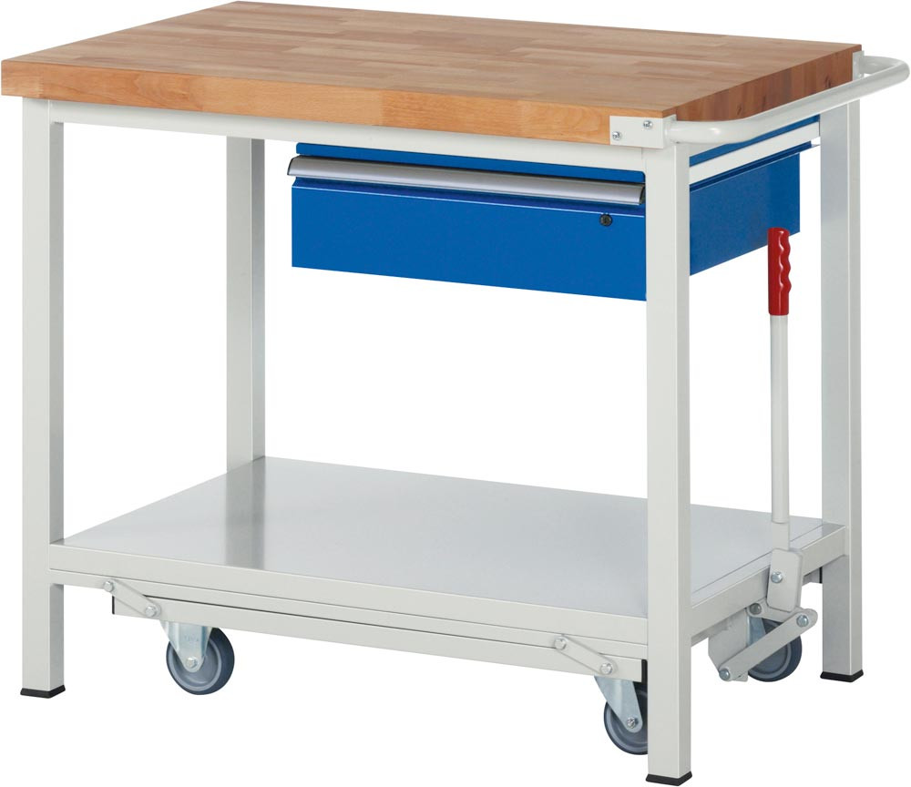 Werkbank mit absenkbarem Fahrgestell, BxTxH 1000x700x880 mm, 1 Hängeschublade 150 mm, Platte Buche 40 mm, Ablageboden, RAL 7035/5010