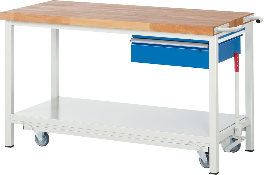 Werkbank mit absenkbarem Fahrgestell, BxTxH 1250x700x880 mm, 1 Hängeschublade 150 mm, Platte Buche 40 mm, RAL 7035/5010 EP529987