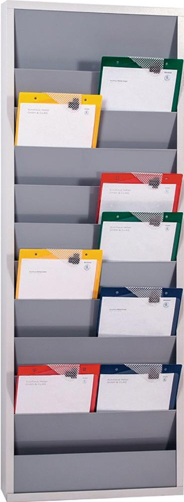 Stahlblech pulverbeschichtet · für Auftragstaschen oder Belege DIN A4 · Tafeln beliebig aneinander ansetzbar · Einstecktiefe 210 mm · Sichtrand 96 mm · Lieferung inkl. Befestigungsmaterial