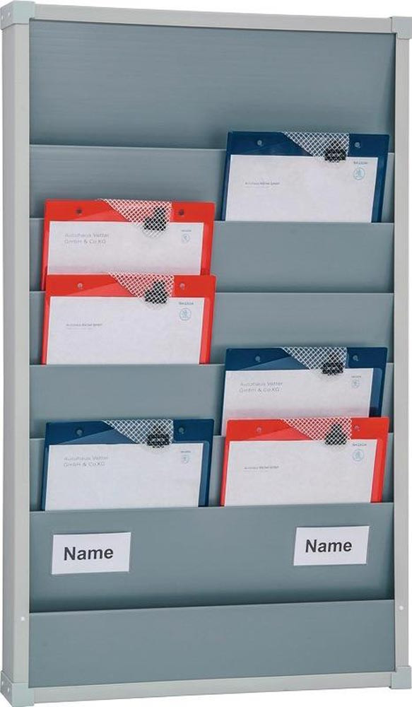 Kunststoff Polypropylen · für 6 bis 30 Auftragstaschen oder Belege DIN A4 · mit Ablagefach, Tafeln beliebig aneinander ansetzbar · Einstecktiefe 210 mm · Sichtrand 96 mm · Lieferung inkl. Befestigungsmaterial