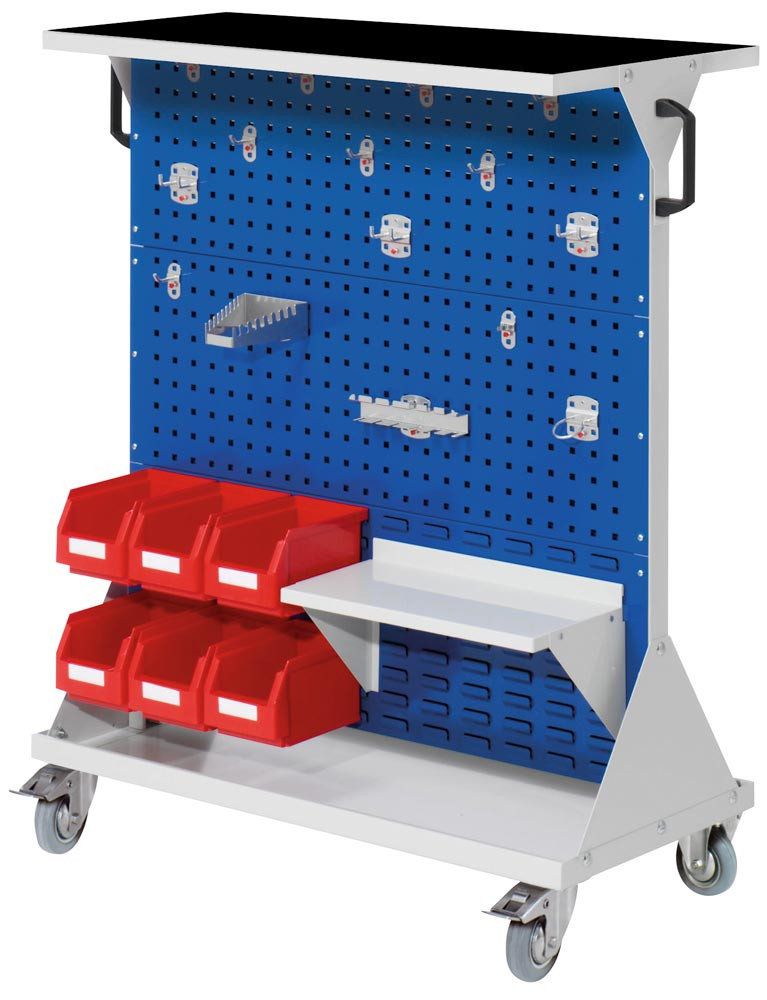 Werkstattwagen, 4 Loch-/2 Schlitzpl., 1 Hakensort. 15-tlg., 10 Kästen, BxTxH 1000x500x1270 mm, 1 Auflageboden Stahl, RAL 7035/5010 EP535984
