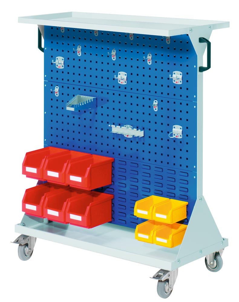 Werkstattwagen, 4 Loch-/2 Schlitzpl., 1 Hakensort. 15-tlg., 10 Kästen, BxTxH 1000x500x1270 mm, 1 Auflageboden Stahl, RAL 7035/5010 EP535984