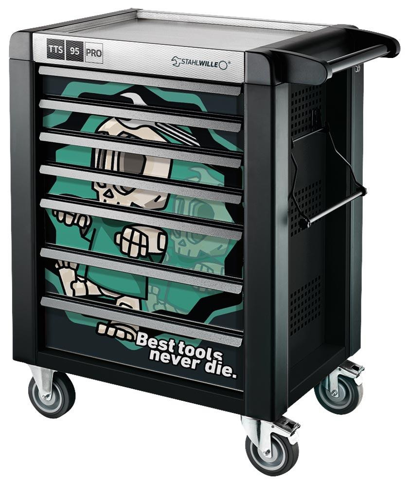 Robuster Werkstattwagen mit exklusiver UV-Lackierung im Sonderdesign "Best tools never die" ∙ 7 große Schubladen mit Vollauszug sorgen für eine effiziente Organisation von Werkzeug und Material ∙ Statische Belastbarkeit von bis zu 750 kg - die untere Schublade hat dabei eine Traglast von bis zu 45 kg ∙ Öl- und säurebeständige, kugelgeführte Leichtlaufräder (Rollen-Ø125 mm) mit Fadenschutz ∙ Beidseitige Lochraster