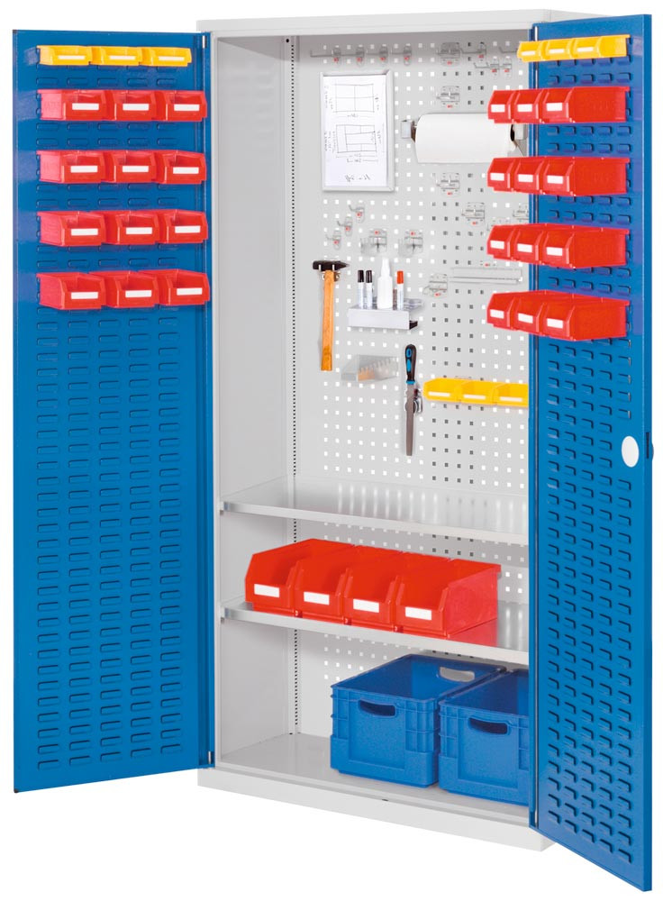 Werkzeugschrank, Türen mit Schlitzplatten, BxTxH 1000x500x1950 mm, 2 Fachböden, RAL 7035/5010 EP521312