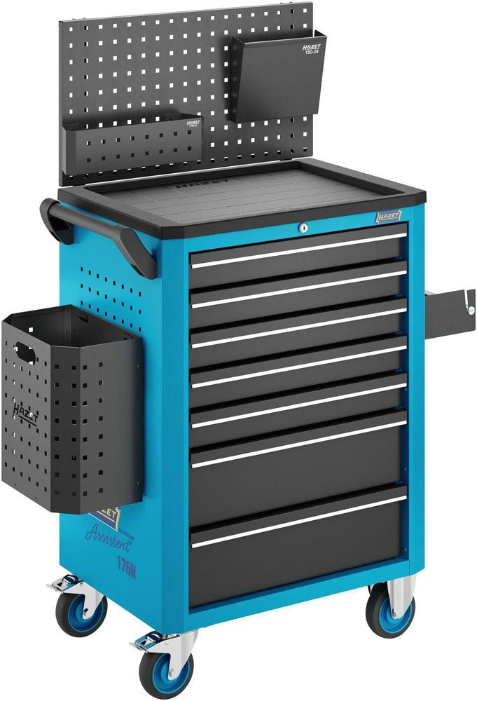 Anwendung: Effiziente · mobile Organisation von Werkzeug. Werkzeug- · Material- und Montagewagen. 5 flache und 2 hohe Schubladen. Komplett mit 147-teiligem Werkzeug Sortiment in Safety-Insert-System Weichschaumeinlage. Hohe Flexibilität. Griff und Rollen wahlweise links oder rechts montierbar. Praktisches HAZET Design. Griffleisten für angenehme Haptik. Kunststoffhaube mit Texturen und großer vertiefter · komplett nutzbarer Arbeitsfläche. Komplett abgedichtete Arbeitsfläche schützt Wageninneres bei auslaufenden Flüssigkeiten. Abgeschrägte Kanten vermeiden Beschädigungen. Zahlreiche Befestigungsmöglichkeiten. Zubehör · wie z. B. HAZET Papierkorb · Dosenhalter an linker und rechter Seite montierbar. Rückwärtige Schraubpunkt zur Montage von weiterem Zubehör. Arbeitsflächen. Deutlich vergrößerte Ablage- und Arbeitsfläche in Kunststoff. Modernes Oberflächendesign der Arbeitsfläche. Lösemittelbeständige Arbeitsfläche schützt Wageninneres bei auslaufenden Flüssigkeiten. Umrandung der Arbeitsfläche schützt Teile vor Herabfallen. Korpus / Fahrgriff. Extrem robuste Ausführung durch doppelwandige Konstruktion. Komplette Schweißkonstruktion des ganzen Korpus für den täglichen harten Werkstatteinsatz. Individuelle Befestigungsmöglichkeiten durch Quadrat-Lochraster auf Seitenwänden · z. B. für HAZET Hakenprogramm Artikelgruppe 112 für Werkzeuge oder andere Anbauteile wie z. B. Dosenhalter · Papierrollenhalter · Papierkorb · etc.. Stabiler Fahrgriff beidseitig fest am Korpus montierbar. Verriegelungs-Konzept. 2-stufige VerriegelungZentralverriegelung · abschließbar durch Zylinderschloss mit 2 Knickschlüsseln. Gegenseitige Auszugssperre für minimales Kipprisiko. Schubladen-Konzept. Gegenseitige Verriegelung der Schubladen verhindert ungewolltes Öffnen. 100 % Auszug mit Rollenführungen. Schubladendesign zur optimalen Nutzung des Innenraums. Schubladenfronten für optimiertes Handling. Schmutzunempfindliche Schubladen-Beschichtung zur einfachen Reinigung. Hochleistungs-Fahrwerk. Große stark belastbare Räder mit Präzisionskugellager und zweifachem Kugelkranz im Schwenklager · einfaches Bewegen auch bei hoher dynamischer Last. 2 Lenkrollen mit Doppelstopp: Gebremste Rollen verhindern Wegrollen. Gebremste Schwenklager verhindern Drehen der Lenkrollen · z. B. auf schrägen Flächen. Schutzring verhindert Eindringen von Schmutz und Fäden. Elastikrollen ermöglichen ruhigen Lauf. Gesamttragkraft (dynamisch): 480 kg. Gesamttragkraft (statisch): 480 kg. Traglast hohe Schublade: 20 kg. Farbe: HAZET blau. Maße: 780 mm x 498 mm x 1018 mm. (Schubladen)größe für Ordnungssystem: 3/3. Höhe Arbeitsfläche: 1002 mm. Anzahl Bockrollen: 2 (∅ 125 mm). Anzahl Lenkrollen: 2 (∅ 125 mm). Anzahl Werkzeuge: 147.