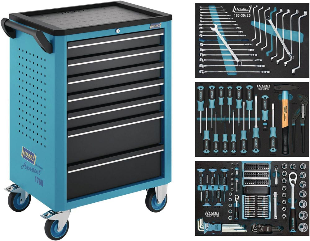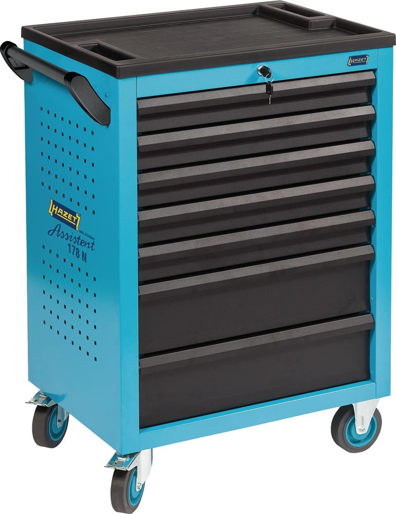 Werkzeug-, Material- und Montagewagen · 5 flache und 2 hohe Schubladen · komplett mit 193-teiligem Werkzeug Sortiment in Safety-Insert-System Weichschaumeinlage · hohe Flexibilität · Griff und Rollen wahlweise links oder rechts montierbar · Griffleisten für angenehme Haptik · Kunststoffhaube mit Texturen und großer vertiefter, komplett nutzbarer Arbeitsfläche · komplett abgedichtete Arbeitsfläche schützt Wageninneres bei auslaufenden Flüssigkeiten · abgeschrägte Kanten vermeiden Beschädigungen · zahlreiche Befestigungsmöglichkeiten · Zubehör, wie z.B. HAZET Papierkorb, Dosenhalter an linker und rechter Seite montierbar · rückwärtiger Schraubpunkt zur Montage von weiterem Zubehör