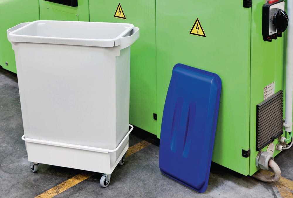 für Müll-Wertstoffsammlung · aus stabilem Polypropylen (PP) · die farbigen Deckel (Zubehör) erleichtern die Abfalltrennung
