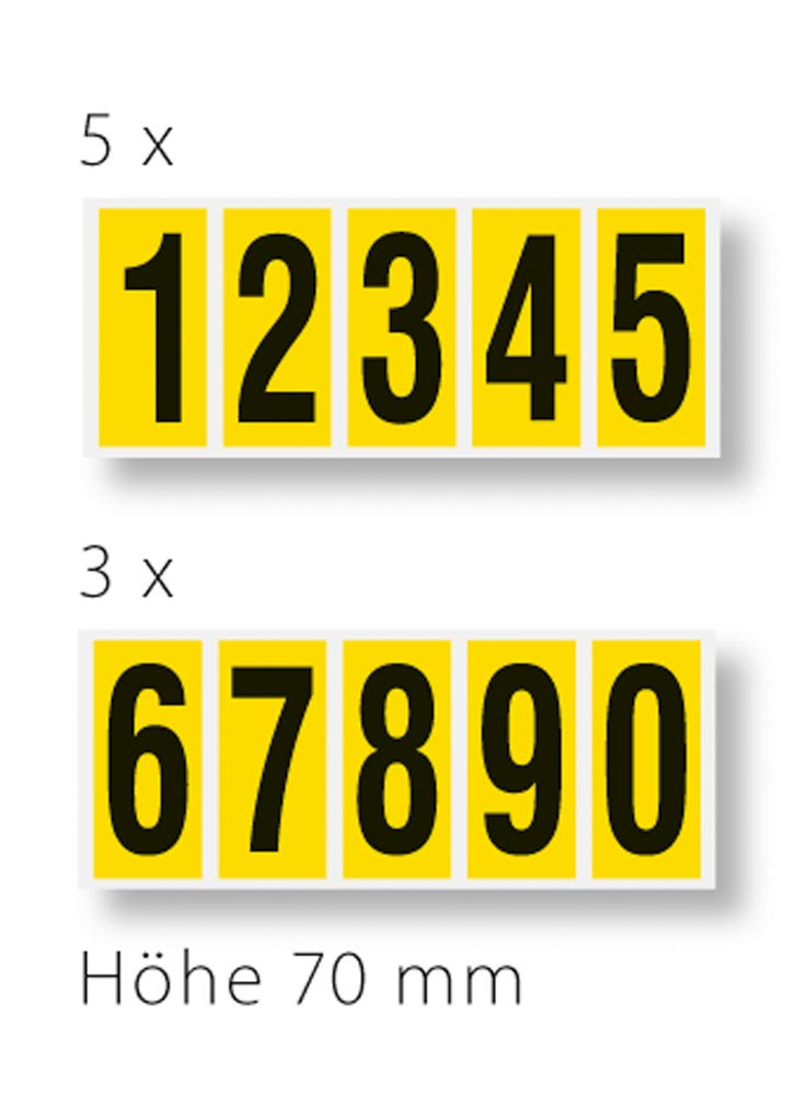 Ziffern 0-9, selbstklebend, Schrifthöhe 70 mm, VE 200 Etiketten mit 24x1-5 und 16x6-0, Schrift schwarz, Etikett gelb