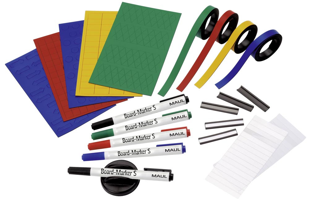 Inhalt: ∙ 20 Namens-Profilschilder 50 x 10 mm ∙ 20 Kartonstreifen für Namens-Profilschilder ∙ 4 Boardmarker (rot, blau, grün, schwarz) ∙ 1 Tafelwischer mit Boardmarker ∙ 4 Magnetstreifen 1000 x 10 mm (rot, blau, grün, gelb) ∙ Je 1 Bogen Magnetsymbole: Rechteck 10 x 20 mm (56 Stück), Quadrat 10 x 10 mm (112 Stück), Dreieck 10 x 10 mm (180 Stück), Kreis Ø 10 mm (50 Stück), Pfeil 10 x 20 mm (30 Stück)